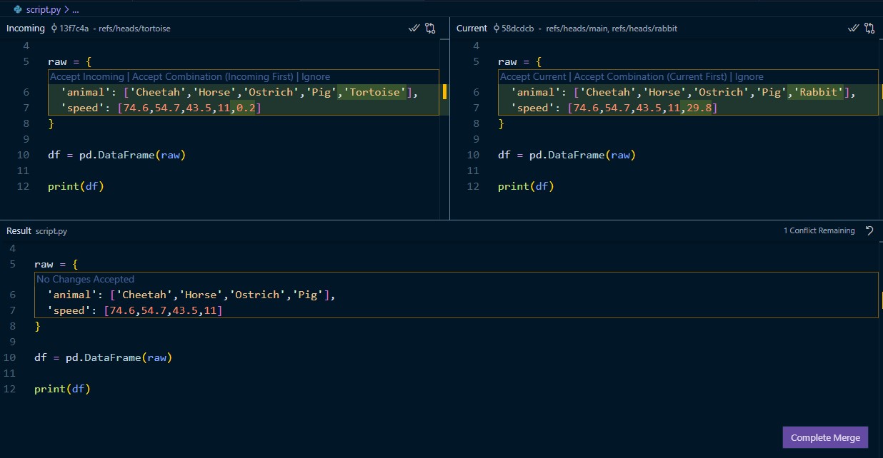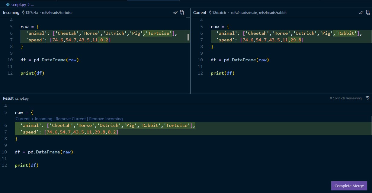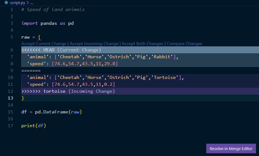 print(df)git commit -am "Added tortoise" # stage and commit the changesMerge rabbit into main
