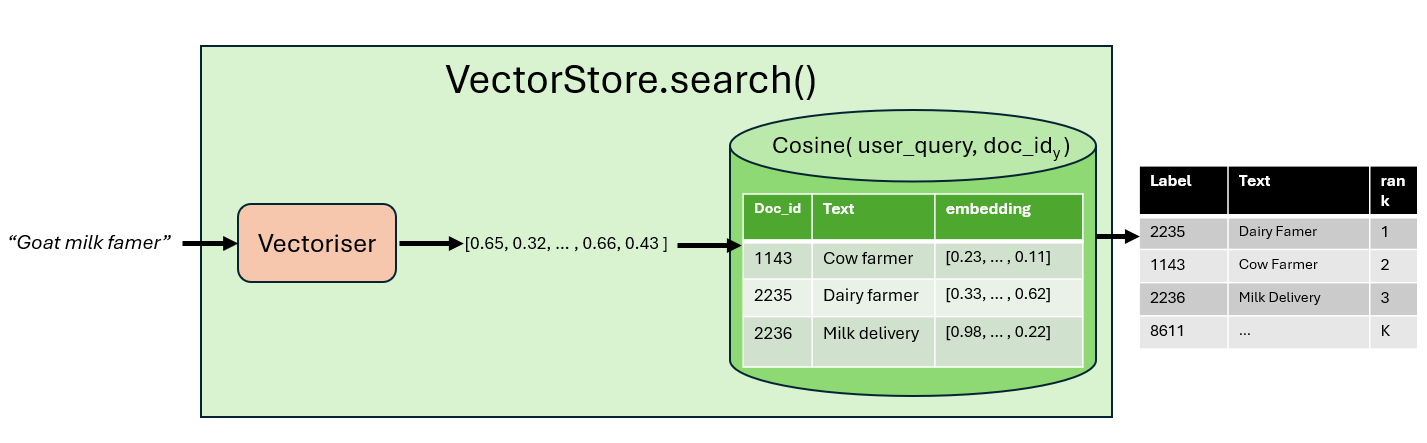 Semantic search uses a vectoriser (usually a language model) to convert each document into a vector (called an embedding). When a query (another piece of text) arrives from the user, the query is first embedded in the same way as a vector of numbers, then the query embedding is compared to each of the embeddings in the knowledgebase by calculating similarities between vectors. The top N closest knowledgebase entries are returned along with the matching labels, documents and distance scores for each one.